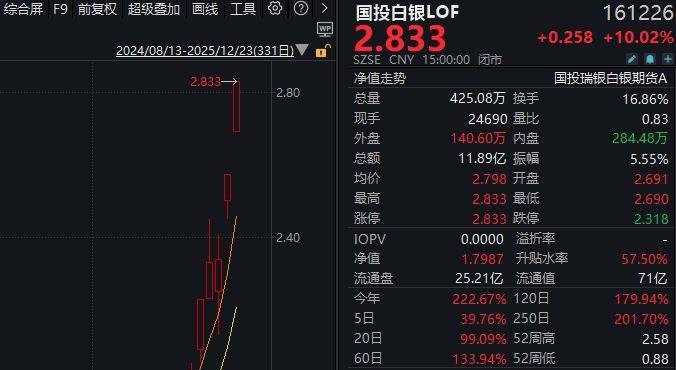 12月23日,国投白银LOF又涨停了,截至收盘,场内价格来到2.833元,相较最新A份额净值1.7987元溢价57.5%,再创阶段新高。