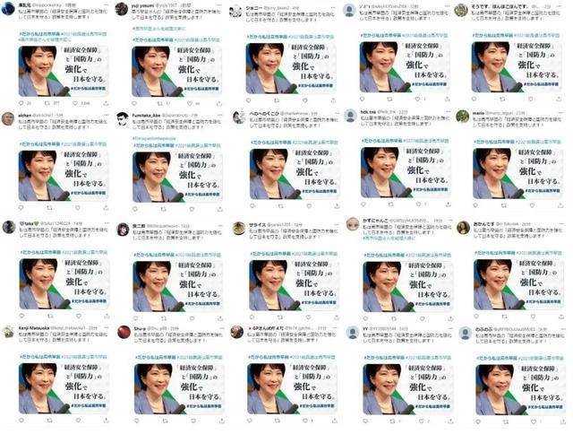 日本网民分享的图片显示,有大量不同账号发表了支持高市的相似帖文,文字内容几乎一模一样,图片也是用的同一张宣传海报。