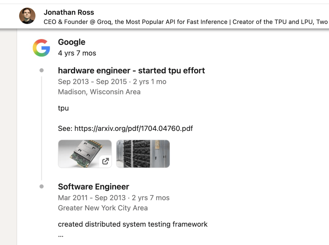 更耐人寻味的是创始人Jonathan Ross的背景。他曾是谷歌张量处理单元(TPU)的核心研发者之一,而TPU正是英伟达GPU在AI领域的主要竞争对手。