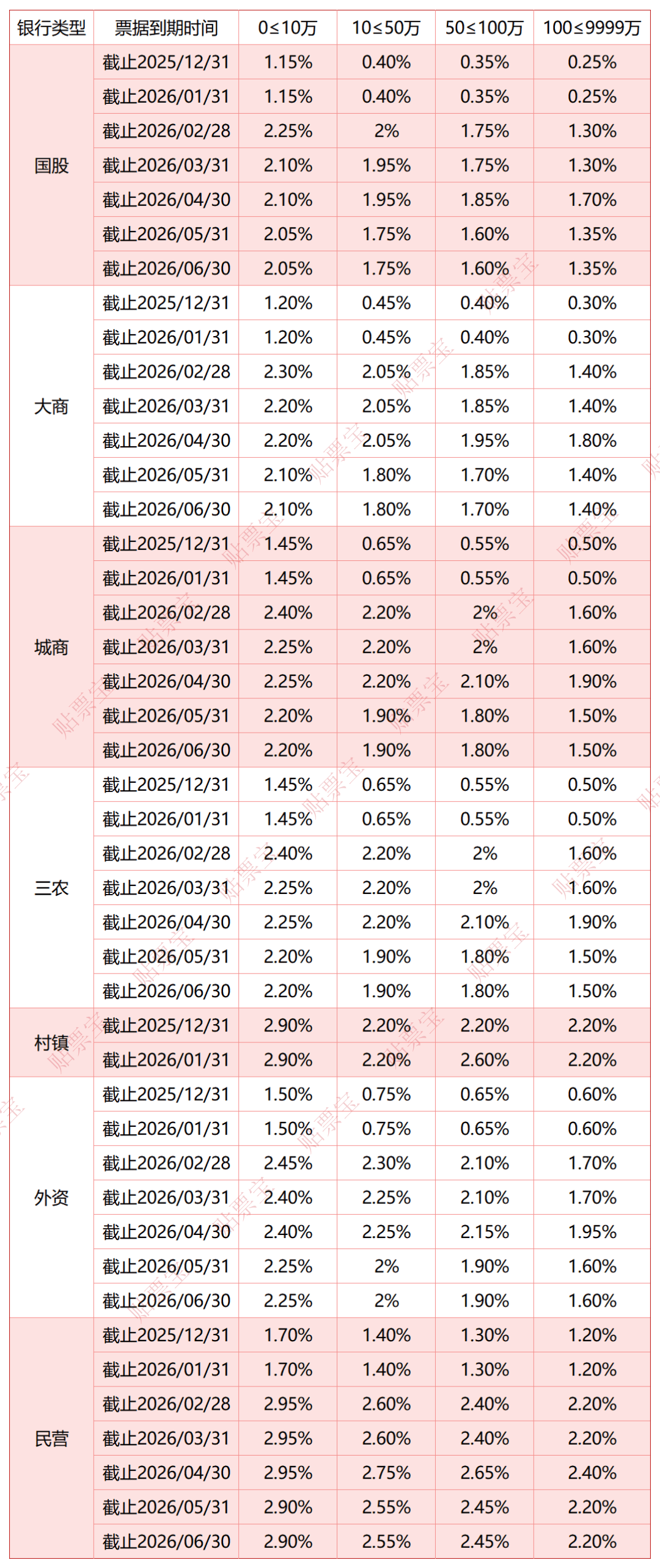以下为2025年12月25日的银行承兑汇票贴现利率报价表(来源贴票宝):