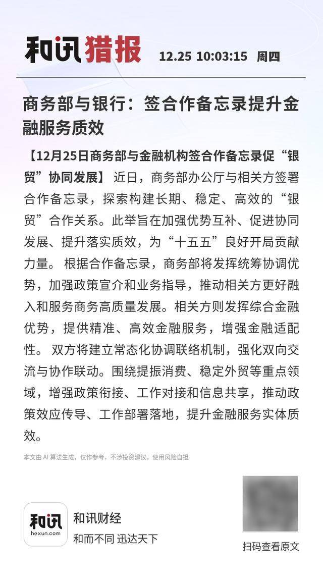 【12月25日商务部与金融机构签合作备忘录促“银贸”协同发展】近日,商务部办公厅与相关方签署合作备忘录,探索构建长期、稳定、高效的“银贸”合作关系。此举旨在加强优势互补、促进协同发展、提升落实质效,为“十五五”良好开局贡献力量。根据合作备忘录,商务部将发挥统筹协调优势,加强政策宣介和业务指导,推动相关方更好融入和服务商务高质量发展。相关方则发挥综合金融优势,提供精准、高效金融服务,增强金融适配性。双方将建立常态化协调联络机制,强化双向交流与协作联动。围绕提振消费、稳定外贸等重点领域,增强政策衔接、工作对接和信息共享,推动政策效应传导、工作部署落地,提升金融服务实体质效。