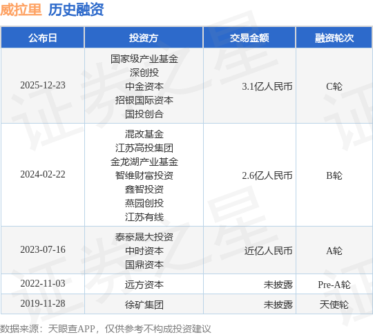 证券之星消息,根据天眼查APP于12月23日公布的信息整理,江苏威拉里新材料股份有限公司C轮融资,融资额3.1亿人民币,参与投资的机构包括国家级产业基金,深创投,中金资本,招银国际资本,国投创合,投后估值21.1亿人民币。