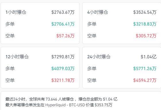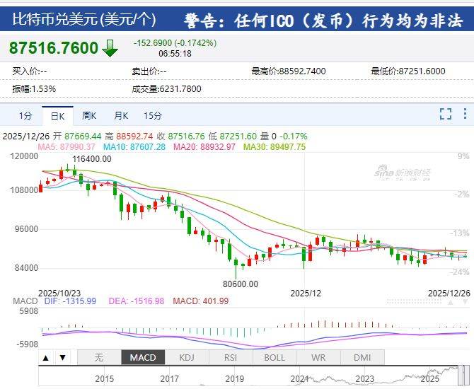 截至12月26日发稿,比特币报87516.76美元。数据显示,24小时,全球共有73643人被爆仓,爆仓总金额为1.04亿美元。