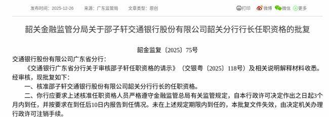 2025年12月26日,根据国家金融监督管理总局消息,《交通银行广东省分行关于审核邵子轩任职资格的请示》获得通过,批复邵子轩交通银行股份有限公司韶关分行行长的任职资格。