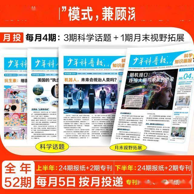 “老牌”基因与“新势力”创新,让《少年科普报》成为孩子科学启蒙黄金载体。作为青少年科普报品类的开创者,以及现象级爆款产品《大语文知识画报》的延伸品类,《少年科普报》成为始终坚守“强大科普理念,普及科学,开发智力,开展活动,培养综合型人才”的宗旨,通过科学教育的独特魅力,实现课内教育与课外阅读、实践活动的深度融合,助力培养新一代学生“思维活跃、想象丰富、多才多艺、实用创新”的综合素质。