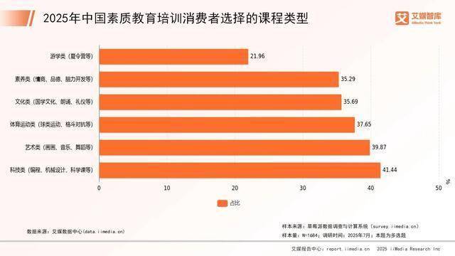 与此同时,家庭教育需求已从传统学科辅导向素质教育全面升级。在素质教育课程选择中,科技类课程以41.44%的选择率拔得头筹,超过艺术类、体育运动类、文化类等选项,培养孩子的“理科脑”、提升科技素养,已成为家庭教育的核心诉求。