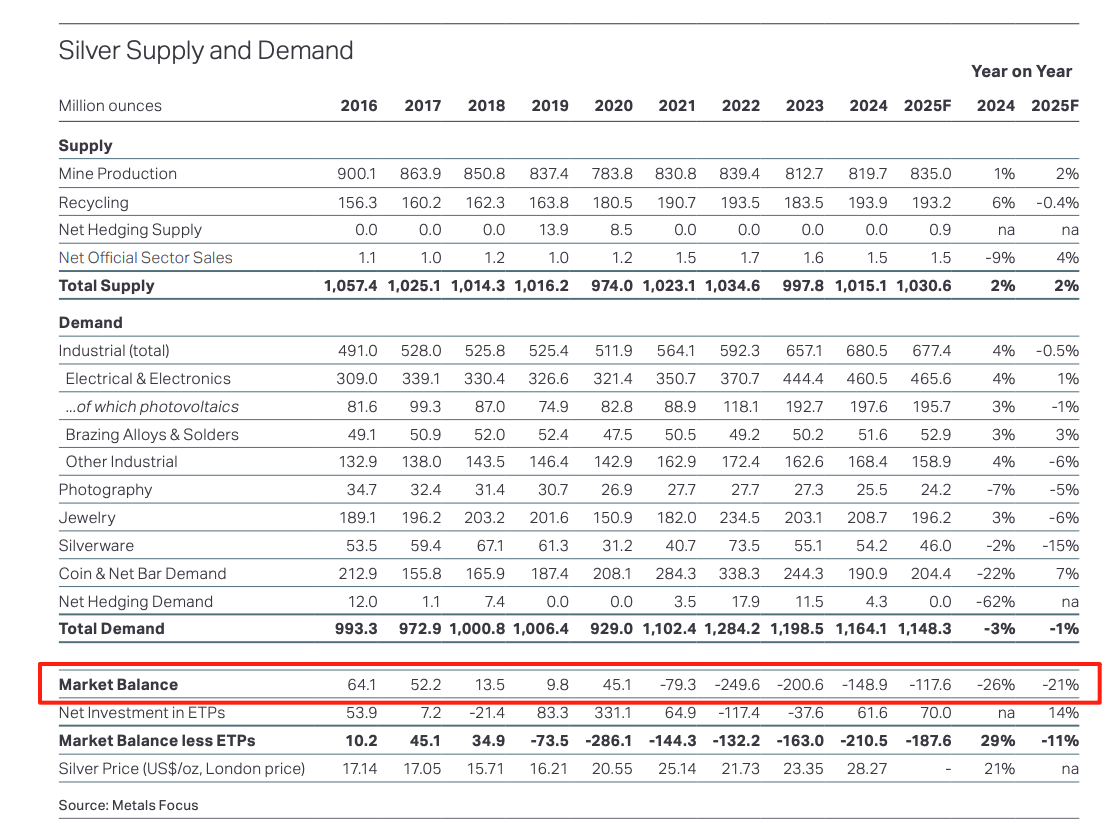 (2025年全球白银缺口预计为1.176亿盎司 图源:白银协会)