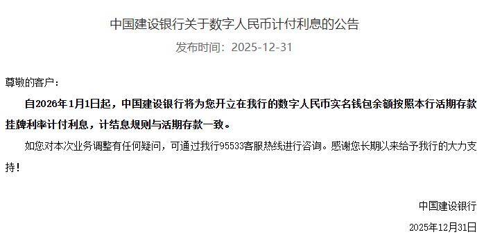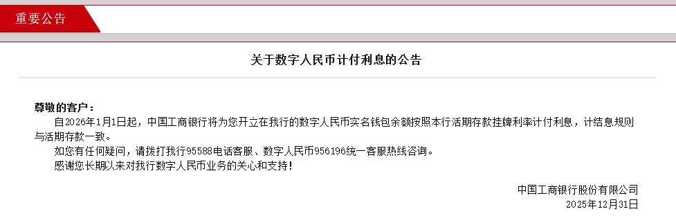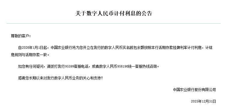 IT之家 12 月 31 日消息,工商银行、农业银行、中国银行、建设银行、交通银行、邮储银行等多家银行今天(12 月 31 日)发布公告,从 2026 年 1 月 1 日起,将为客户开立的数字人民币实名钱包余额按照活期存款挂牌利率计付利息,计结息规则与活期存款一致。