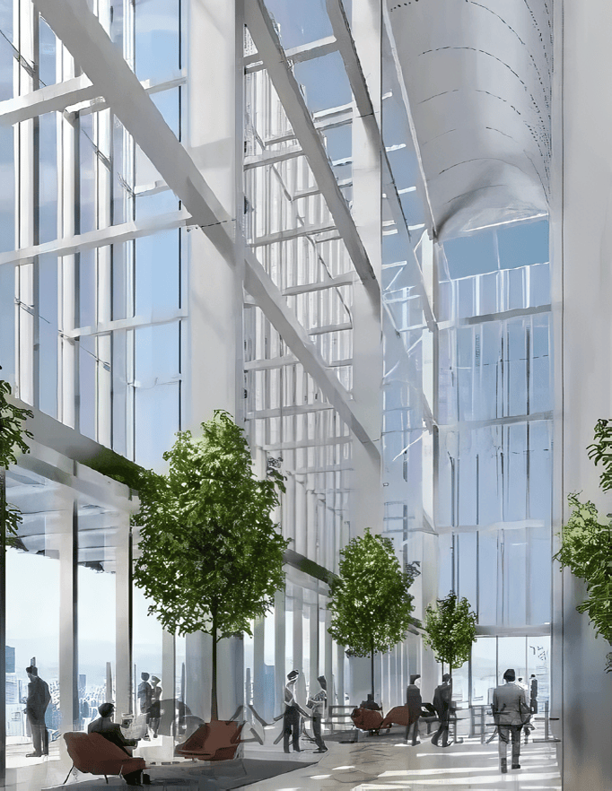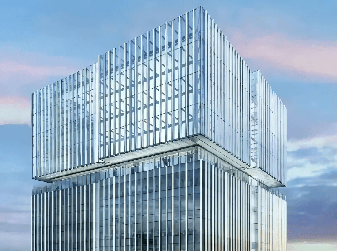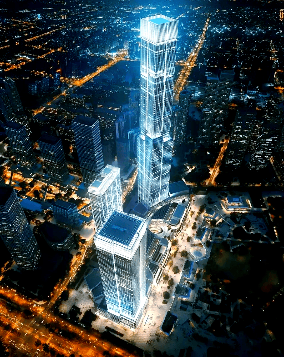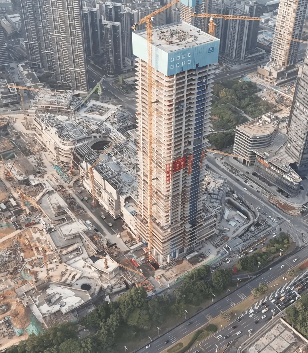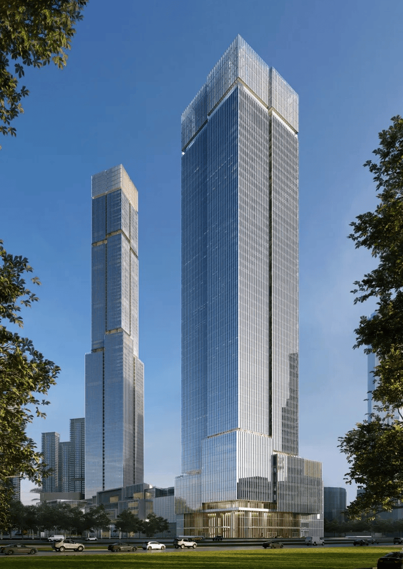 幕墙系统采用高性能玻璃,在优化自然采光的同时也符合节能标准。楼内还设有多个防火避难层,在保障安全的前提下,也为建筑外立面增添了节奏感。施工中应用了铝模快拆与进度可视化技术,实现了六天一层的建造速度。