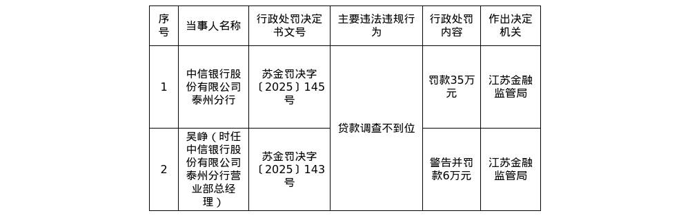 针对这一行为,国家金融监督管理总局江苏监管分局对其罚款35万元;对时任中信银行股份有限公司泰州分行营业部总经理的吴峥,警告并处罚款6万元。