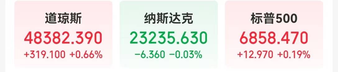 当地时间2026年1月2日,美股三大指数收盘涨跌不一,纳指高开低走,收跌0.03%,标普500指数微涨0.19%,道指涨0.66%。