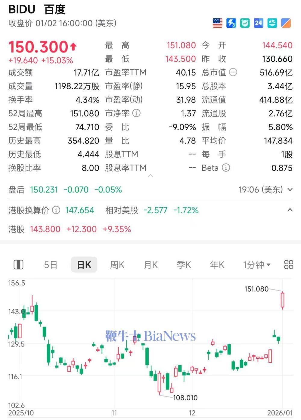 1月3日,截至美股收盘,百度大涨15%,每股报150.3美元,市值重回500亿美元。