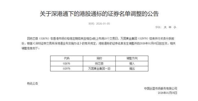 1月5日,深交所公告,因纳芯微(02676)在香港市场价格稳定期结束且相应A股上市满10个交易日、万国黄金集团(02979)结束并行买卖分拆股份,根据《深圳证券交易所深港通业务实施办法》的有关规定,港股通标的证券名单发生调整并自2026年01月05日起生效。