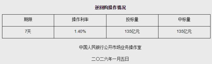 据央行网站消息,2026年1月5日中国人民银行以固定利率、数量招标方式开展了135亿元7天期逆回购操作。具体情况如下: