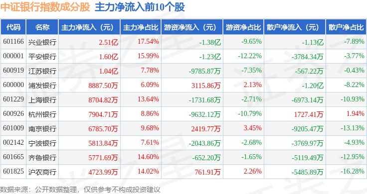 资金流向方面,中证银行(399986)指数成份股当日主力资金净流入合计1.06亿元,游资资金净流入合计7237.45万元,散户资金净流出合计1.78亿元。成份股资金流向详情见下表: