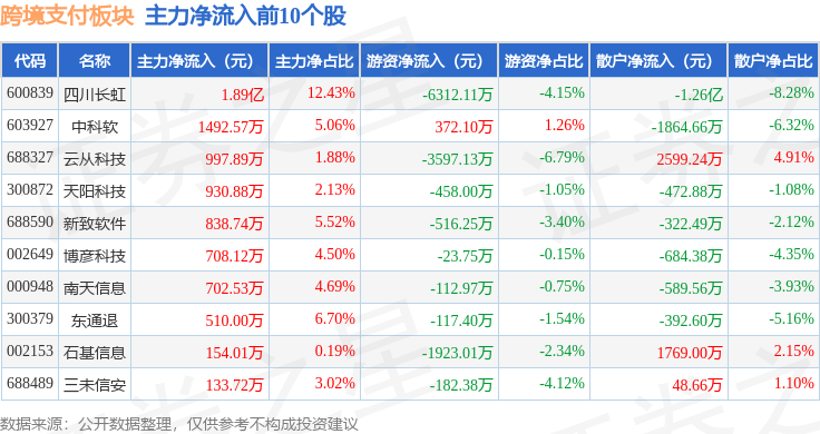 从资金流向上来看,当日跨境支付板块主力资金净流出17.45亿元,游资资金净流入2.4亿元,散户资金净流入15.05亿元。跨境支付板块个股资金流向见下表: