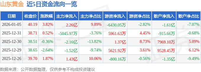 证券之星消息,截至2026年1月5日收盘,山东黄金(600547)报收于40.19元,上涨3.82%,换手率1.6%,成交量57.68万手,成交额22.81亿元。