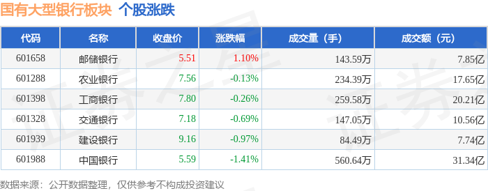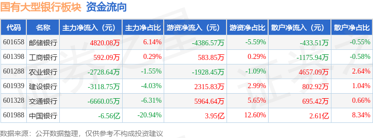 从资金流向上来看,当日国有大型银行板块主力资金净流出7.27亿元,游资资金净流入4.2亿元,散户资金净流入3.07亿元。国有大型银行板块个股资金流向见下表: