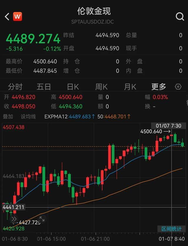 7日早间,现货黄金持续拉升,时隔近两周盘中再次突破4500美元。截至发稿有所回落,微跌0.12%,报4489.274美元/盎司。COMEX黄金期货涨0.18%,报4504.3美元/盎司。