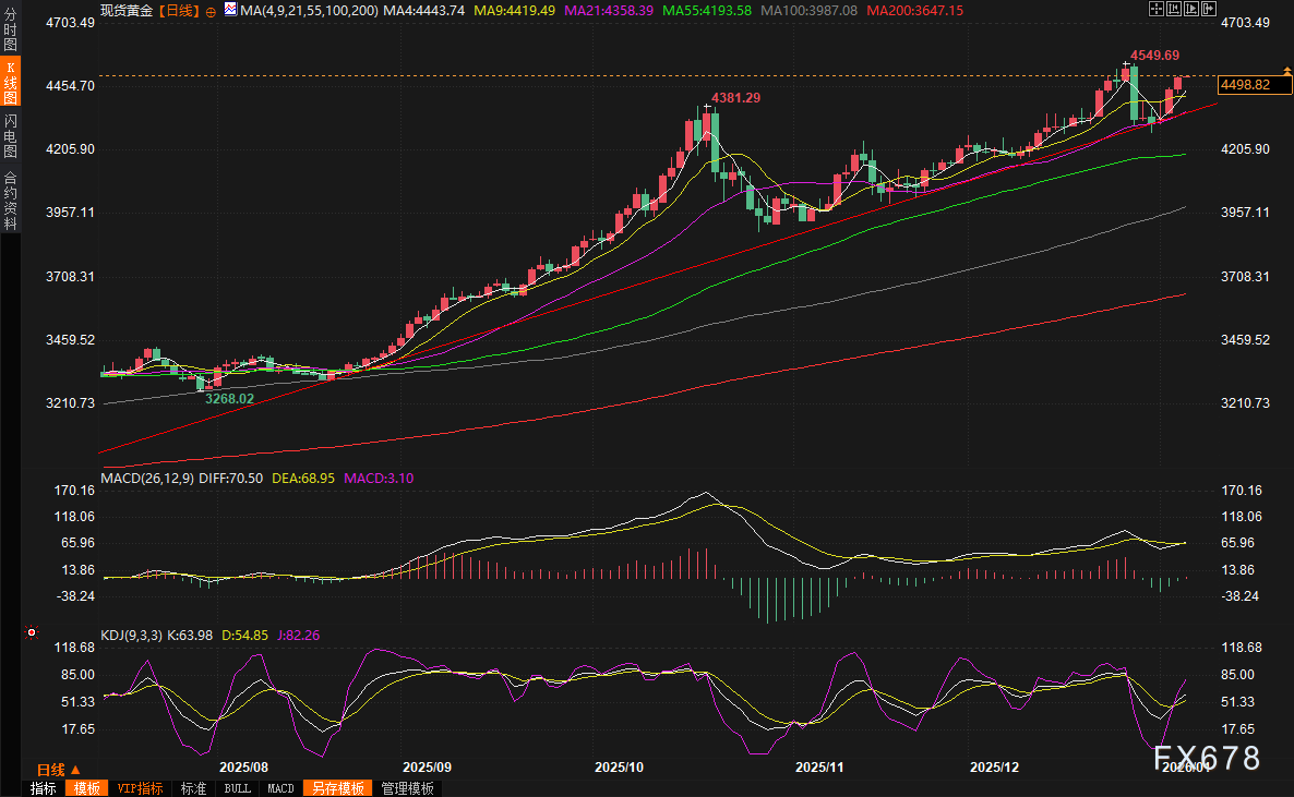 汇通财经APP讯——在全球地缘政治紧张局势急剧升温的背景下,黄金作为传统避险资产的表现异常亮眼。周二,现货黄金价格延续了前一交易日的涨势,进一步上涨约1%,收盘于4494美元每盎司。周三(1月7日)亚市早盘,现货黄金高位震荡,截止07:30,一度触及4500.27美元/盎司,这一价格水平已经非常接近去年12月24日创下的4549.71美元每盎司的历史最高纪录。与此同时,2月交割的美国黄金期货也上涨1%,收报4496.10美元每盎司。黄金价格的这一波上涨,主要源于投资者对全球不确定性的担忧大幅增加,特别是周末美国对委内瑞拉的军事行动引发了广泛的避险情绪,推动资金大量流入贵金属市场。