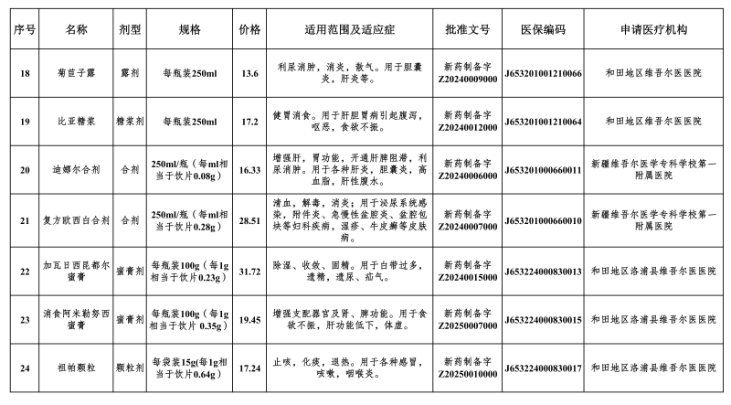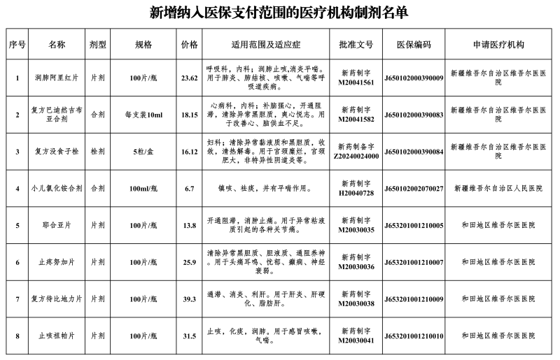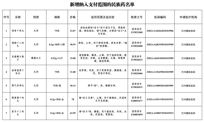 1月6日,自治区医疗保障局网站发布通知,自2月1日起,将消食十味丸等7个民族药、润肺阿里红片等24个医疗机构制剂纳入自治区、兵团基本医疗保险、生育保险和工伤保险支付范围。