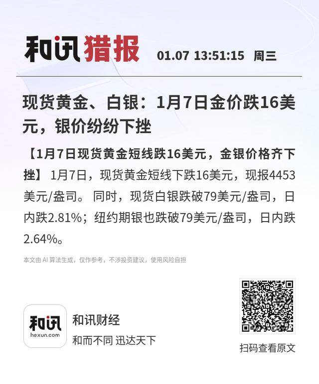【1月7日现货黄金短线跌16美元,金银价格齐下挫】1月7日,现货黄金短线下跌16美元,现报4453美元/盎司。 同时,现货白银跌破79美元/盎司,日内跌2.81%;纽约期银也跌破79美元/盎司,日内跌2.64%。