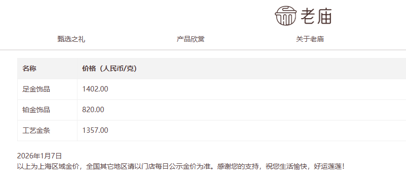 1月7日消息,今日国内黄金饰品价格对比显示,多家品牌公布的境内足金首饰价格持续上行,其中老庙黄金足金饰品报1402元/克,较昨日上涨13元/克;老凤祥足金饰品报1399元/克,周大福足金首饰报1398元/克。