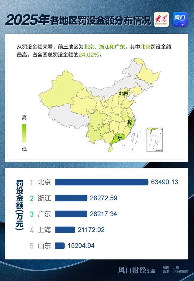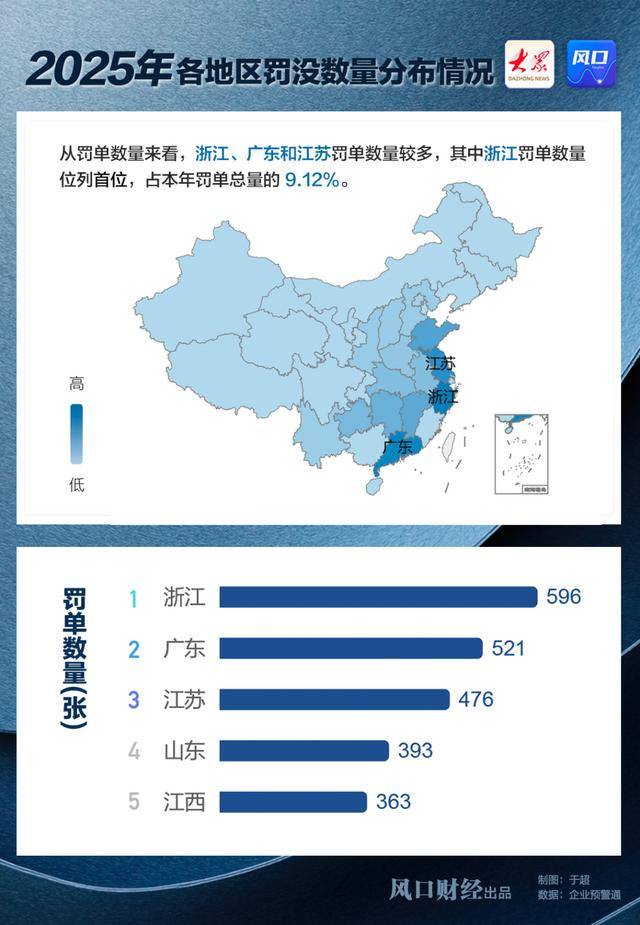 而要论罚单数量,浙江、广东、江苏的银行机构则最为突出,分别达到596张、515张、476张。业内人士分析,这既源于三地经济活跃、银行机构网点基数庞大,也反映了地方监管部门全面贯彻强监管、严监管的基调,对各类违规行为零容忍。