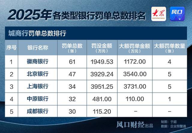 城商行去年共收到728张罚单,罚没金额3.07亿元。其中,徽商银行以61张罚单成为受罚次数最多的城商行,显示出其在内控执行层面存在较多漏洞;而上海银行则以3951.25万元的累计罚没金额,承担了该类别中最高的经济代价。