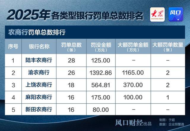 农商行全年累计收到2145张罚单,在各类银行中居首,凸显其作为服务基层金融主力军在业务操作规范性、内控流程的普遍性层面仍面临广泛挑战。其中,广东陆丰农村商业银行以28张罚单成为该类型中的“受罚大户”,渝农商行在2025年累计被罚没1353万元,其中仅在2025年12月下半月就连收4张罚单,合计被罚超千万元,处罚力度显著。