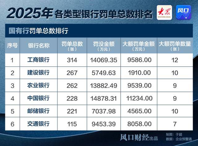 国有大行因其系统重要性,面临的监管始终是全面而审慎的。2025年,六家国有大行合计收到1054张罚单,罚没金额6.51亿元。处罚呈现出“总量均衡、单点突出”的特点。中国银行以约1.49亿元的罚没总额居首,而工商银行则以314张罚单,成为被点名次数最多的国有大行。