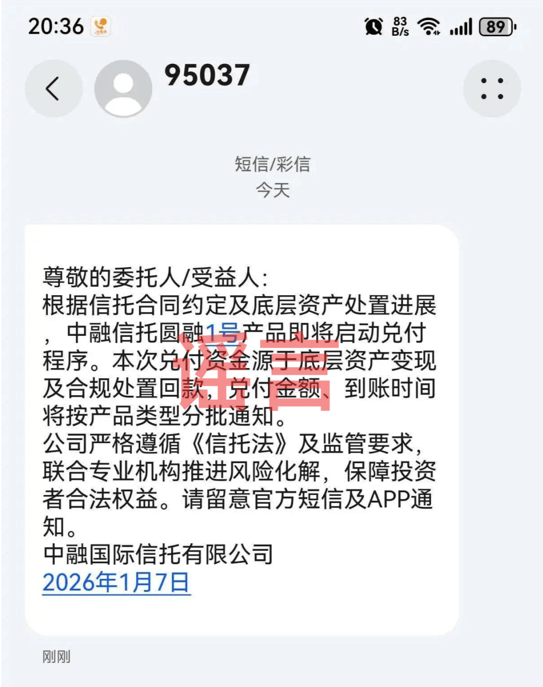该谣言是这样说的:“根据信托合同约定及底层资产处置进展,中融信托圆融1号产品即将启动兑付程序。本次兑付资金源于底层资产变现及合规处置回款,兑付金额、到账时间将按产品类型分批通知。公司严格遵循《信托法》及监管要求,联合专业机构推进风险化解,保障投资者合法权益。请留意官方短信及APP通知。”