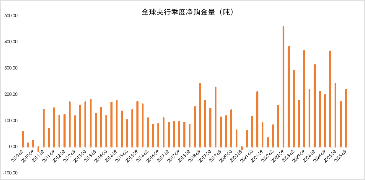 从中长期视角审视,黄金资产的价值跃升具备坚实的底层支撑。当前全球正处于百年变局的深度演化期,地缘政治博弈持续升级,经济运行的不确定性显著加剧,这为黄金的避险需求提供了长期存在的土壤。更为关键的是,美元信用体系的长期根基正在松动,各国央行出于外汇储备多元化的战略诉求,持续增持黄金以对冲主权货币风险,为黄金价格构建起稳固的底部支撑。2025年三季度《全球黄金需求趋势报告》显示,尽管金价处于创纪录的高位,三季度全球央行依然加快了购金步伐,净购金量总计220吨,较二季度增长28%,较上年同比增长10%。从前三季度整体上看,全球央行净购金总量达634吨,虽低于过去三年的异常高位数值,但仍显著高于2022年之前的平均水平。