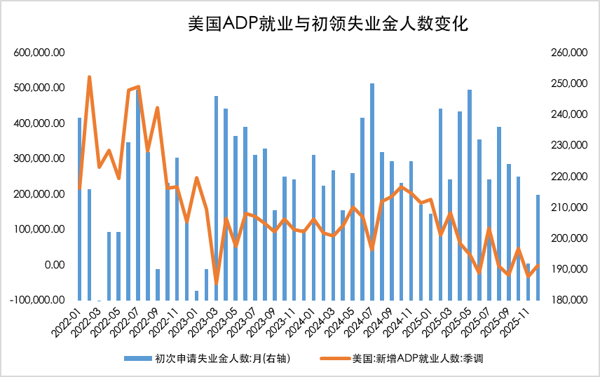 本轮黄金资产的强势表现,并非单一因素驱动,而是美国经济基本面、通胀水平与政策导向等多维度数据形成的共振效应所致。从经济基本面来看,劳动力市场的降温信号持续释放,叠加消费信心指数与地产相关数据的疲弱表现,共同指向美国经济增长动能的放缓。这一变化直接弱化了市场对紧缩政策的预期,为政策转向宽松奠定了基础。11月份的数据显示,美国初次申请失业金人数为 19.2 万人,ADP 新增就业人数为- 3.2 万人,私营部门就业岗位出现净减少,失业申请则处于相对低位。12月份的数据显示,美国初次申请失业金人数上行至 21.4 万人,失业压力有所增加。