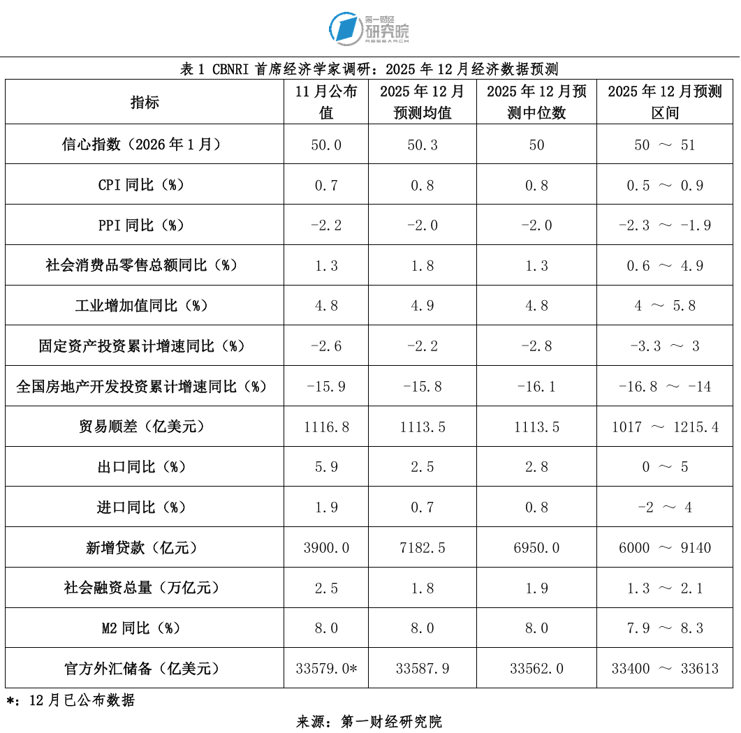 首席经济学家们对2025年12月CPI同比增速的预测均值为0.8%,PPI同比预测均值为-2%。2025年12月工业增加值增速预测均值4.9%,固定资产投资累计增速预测均值为-2.2%,社会消费品零售总额同比增速预测均值为1.8%,贸易顺差预测均值为1113.5亿美元,新增贷款预测均值为7182.5亿元,社会融资总量预测均值为1.8万亿,M2同比增速预测均值为8%。