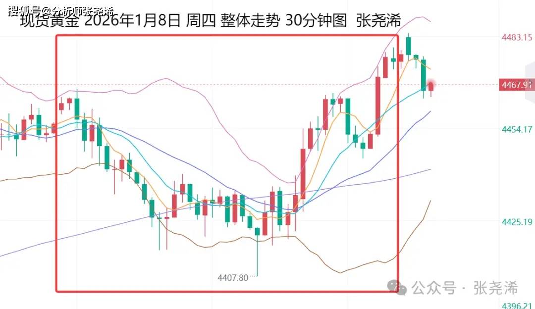 上交易日周四(1月8日):国际黄金触底回升垂线收阳,仍处于中轨及短期均线之上,显示仍有再度走强的前景,但日内周期处于调整走盘,短期或陷入震荡波动,但那方向仍看好继续刷新高点的观点不变。
