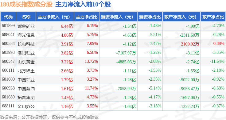 资金流向方面,180成长(000028)指数成份股当日主力资金净流入合计1.89亿元,游资资金净流出合计2.75亿元,散户资金净流入合计8594.93万元。成份股资金流向详情见下表: