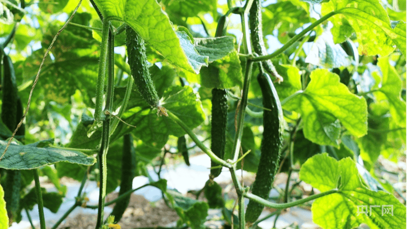 大棚里黄瓜挂藤,鲜绿饱满透着丰收劲(央广网发 原州区委宣传部供图)