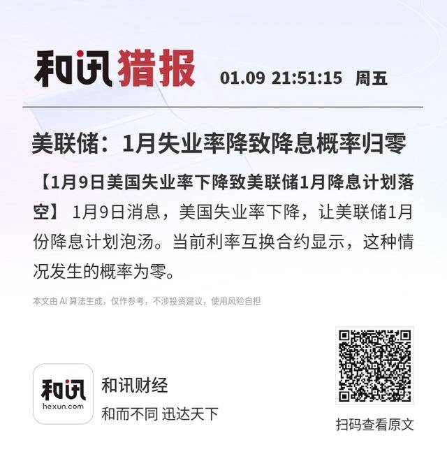 【1月9日美国失业率下降致美联储1月降息计划落空】1月9日消息,美国失业率下降,让美联储1月份降息计划泡汤。当前利率互换合约显示,这种情况发生的概率为零。