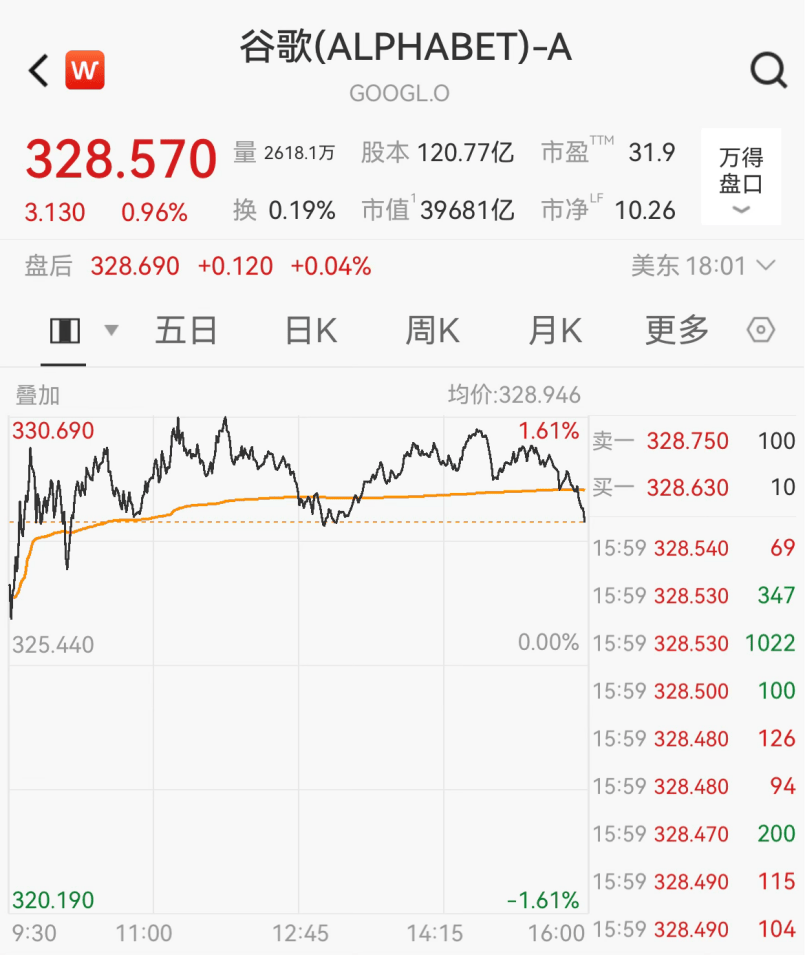 谷歌股价创历史新高,市值一度突破4万亿美元。
