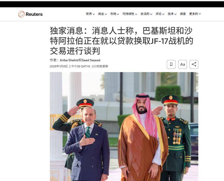 “沙特空军要花40亿美元,买JF-17枭龙战斗机!”当地时间2026年1月8日,英国媒体,路透社发了个大消息,巴基斯坦和沙特正在商讨一项协议,巴基斯坦当局将用一批最新制造的JF-17“枭龙”Block-3战斗机,抵扣巴基斯坦欠沙特的20亿美元贷款,同时沙特再花20亿美元,向中国,巴基斯坦购买JF-17枭龙战斗机的相关武器装备。目前对于英国媒体这个消息,巴基斯坦媒体,沙特媒体全部转发和分析,外网同一时间炸锅了。