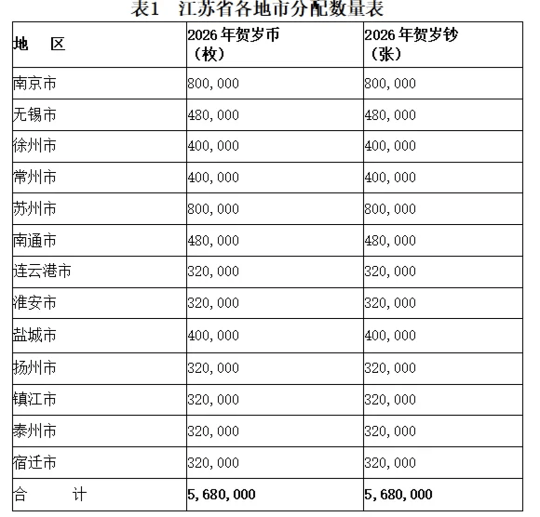 江苏省2026年贺岁币、2026年贺岁钞发行量分别为568万枚、568万张;南京市2026年贺岁币、2026年贺岁钞发行量分别为80万枚、80万张。
