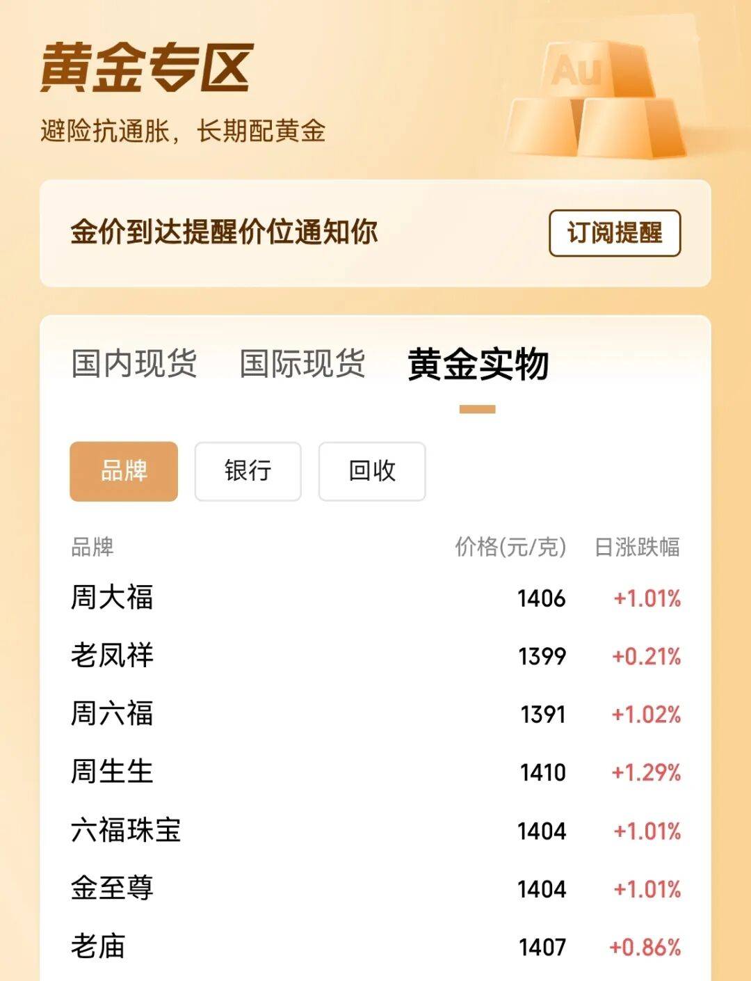 1月11日,各大金饰品牌的实时报价在1400元/克左右。比如周大福1406元/克,周生生1410/克,其他品牌报价从1391元/克至1407元/克不等。有网友说,黄金饰品越来越奔着奢侈品去了。
