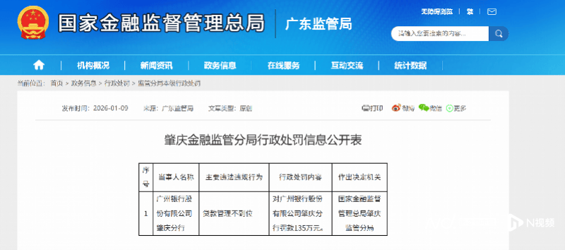 国家金融监督管理总局网站最新公布的行政处罚信息显示,广州银行股份有限公司肇庆分行因贷款管理不到位,被处以135万元罚款。