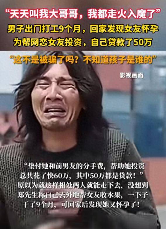 1月10日,内蒙古郑先生求助媒体,称其在soul软件上认识一名女网友,对方总是会叫自己“大哥哥”,很快他就迷失在这声声呼唤中。“给她钱吃饭,她说生孩子娃没有爹,我出钱请保姆买奶粉尿不湿,垫付她和前男友的分手费,帮助她投资,总共花了快60万,其中50万都是贷款!”原以为就这样相处两人就能走下去,没想到郑先生称自己去外地帮女友收水果,一下子干了9个月,可回家后发现她又怀孕了!“这不是被骗了吗?也不知道孩子是谁的!”目前,郑先生报警后警方已立案,女方签下55万欠条,但过去几个月了,女方一分未还。(西安晚报)