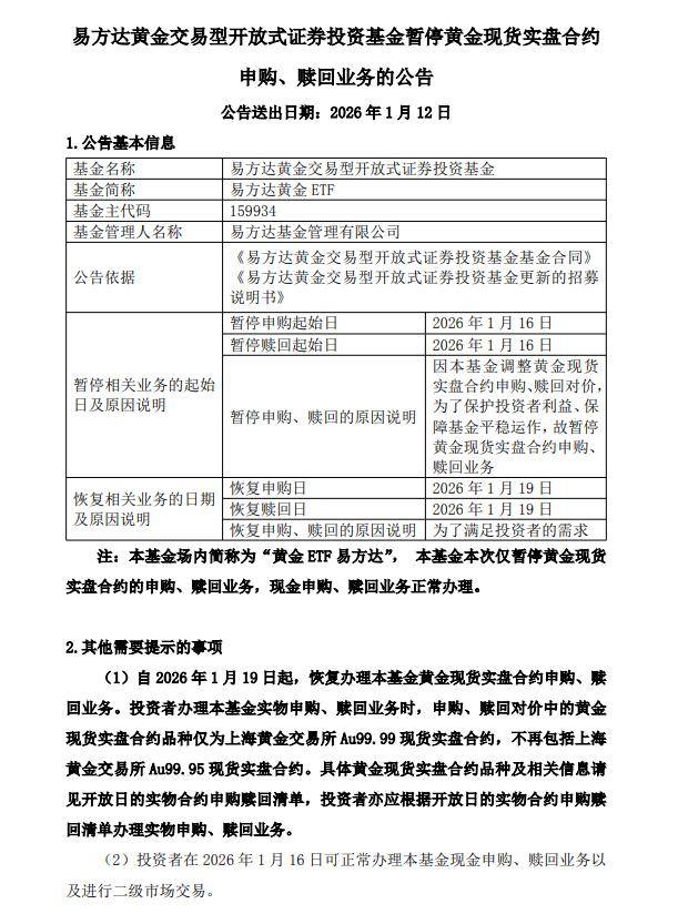 1月12日,易方达基金宣布,旗下易方达黄金ETF自1月16日暂停申购,1月19日恢复。原因是该基金调整黄金现货实盘合约申购、赎回对价,为了保护投资者利益、保障基金平稳运作。