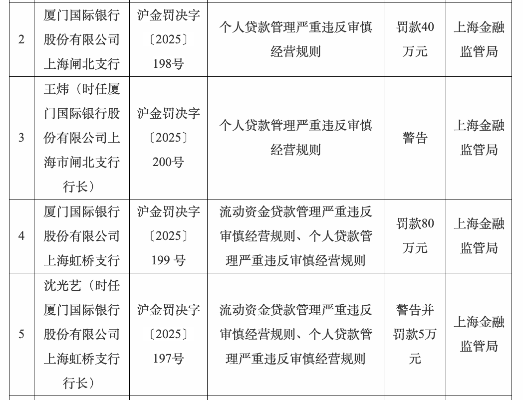 因流动资金贷款管理严重违反审慎经营规则、个人贷款管理严重违反审慎经营规则,厦门国际银行股份有限公司上海虹桥支行被罚款80万元,时任该行行长沈光艺警告并罚款5万元。