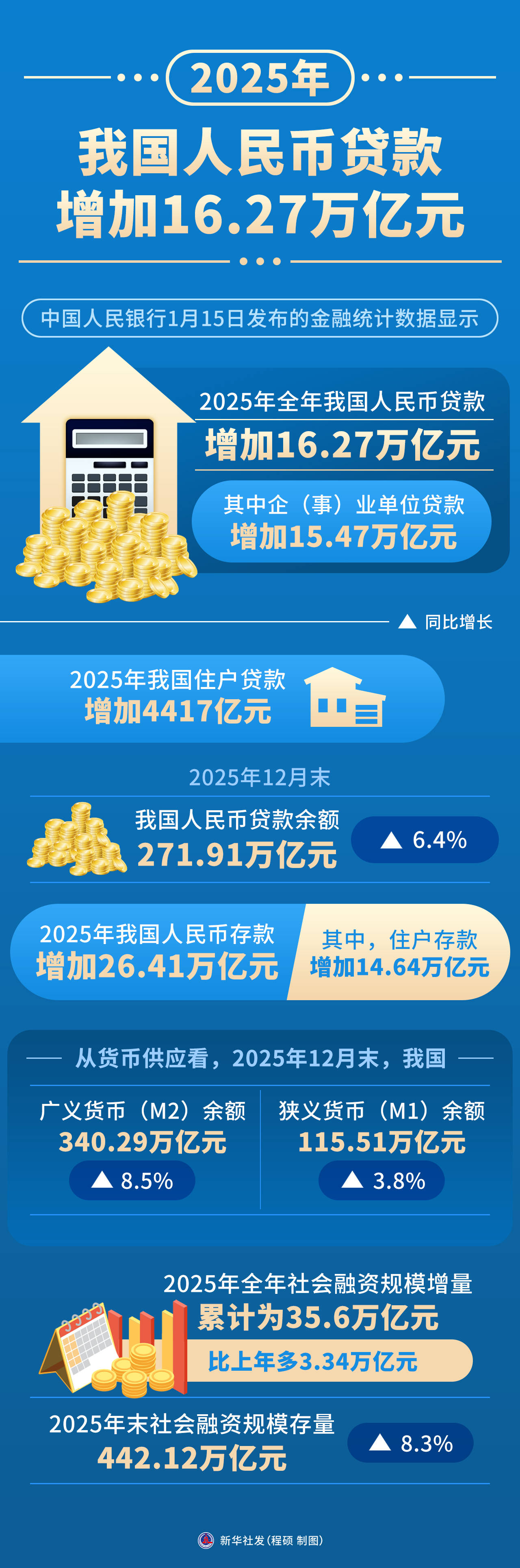 中国人民银行1月15日发布的金融统计数据显示,2025年全年我国人民币贷款增加16.27万亿元,其中企(事)业单位贷款增加15.47万亿元。