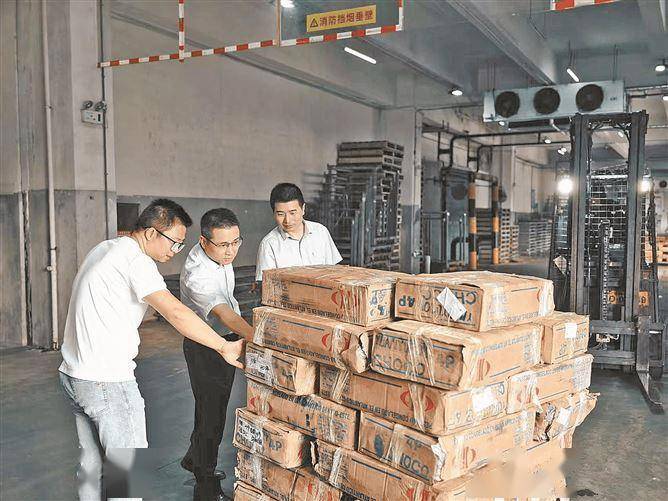 厦门农商银行金融助理走进夏商国际水产交易中心,与冷冻库库管人员一起查看客户冻品仓储情况