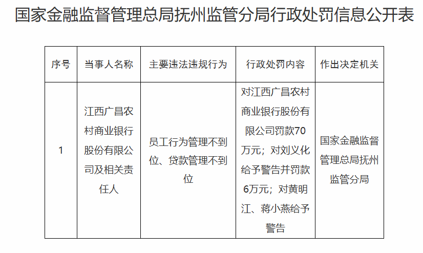【大河财立方消息】1月17日消息,国家金融监督管理总局抚州监管分局日前披露的行政处罚信息公开表显示,因员工行为管理不到位、贷款管理不到位,江西广昌农村商业银行股份有限公司被罚70万元。